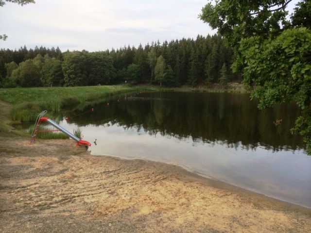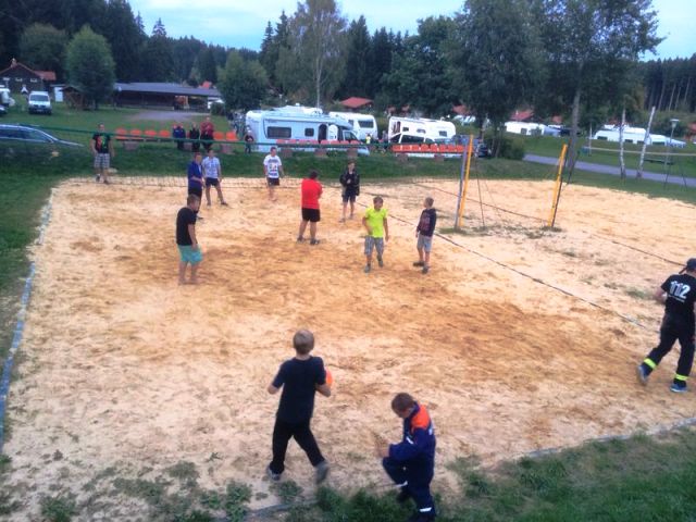 Gegen 14:00 Uhr ging es dann wieder zurück in den Ferienpark. Am Nachmittag waren einige mutige Jugendliche im doch recht kühlen Birnbaumteich baden oder haben sich beim Volleyballspielen vergnügt. Zum Abendessen gab es Kesselgulasch und Steaks, Bouletten und Würstchen vom Grill.
