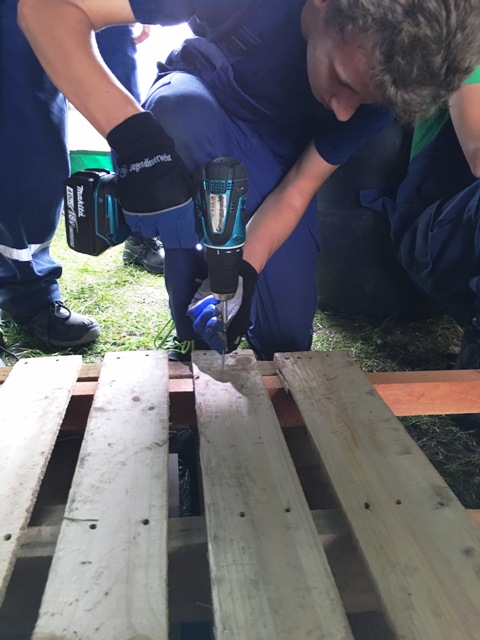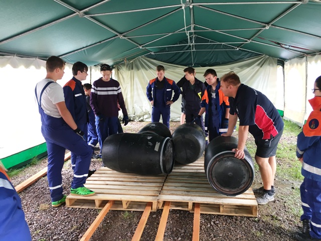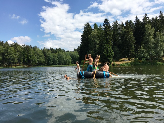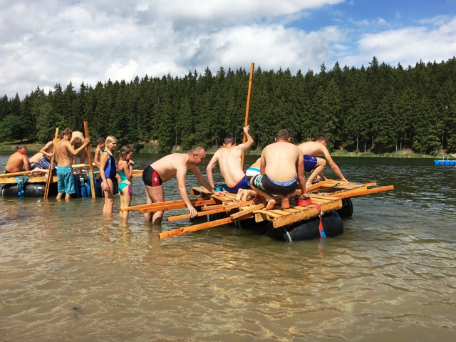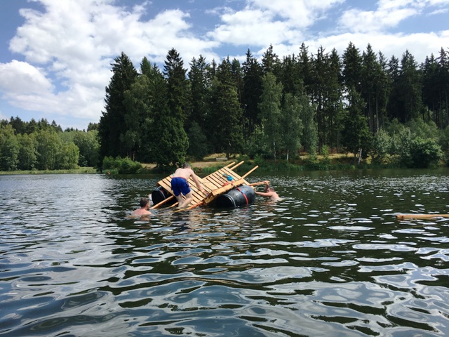 Am Samstag begann nach dem gemeinsamen Frühstück die Teamaufgabe. Hier wurden die Jugendlichen in zwei Gruppen geteilt. Je Gruppe sollte ein schwimmfähiges Floß, welches fünf Personen tragen sollte, gebaut werden. Dazu hatten die Jugendlichen Holzpaletten, Fässer, Seile, Dachlatten, 10 Schrauben, Spanngurte und einen Akkuschrauber zur Verfügung. Beide Gruppen hatten zuvor eine halbe Stunde Zeit um den Bau mit Zettel und Stift zu planen. Nach rund zwei Stunden Bauzeit konnten die beiden Flöße im Birnbaumteich erfolgreich zu Wasser gelassen werden.