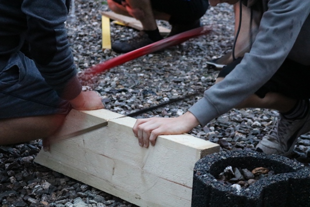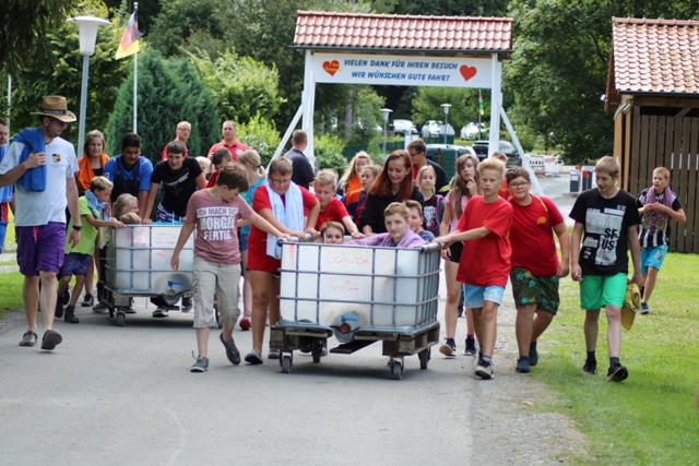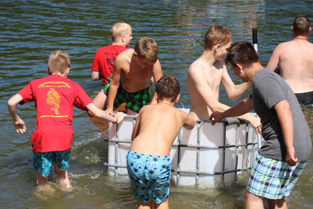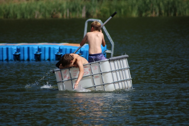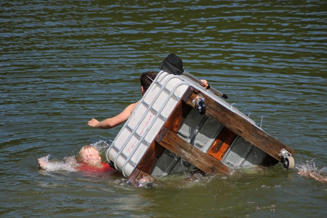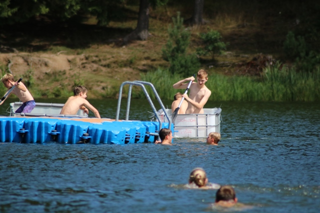 Auf einen verregneten Freitag, folgte zum Glück ein recht sonniger Samstag, an dem die Kids, in zwei Gruppen aufgeteilt, je eine schwimmfähige Seifenkiste bauen mussten.